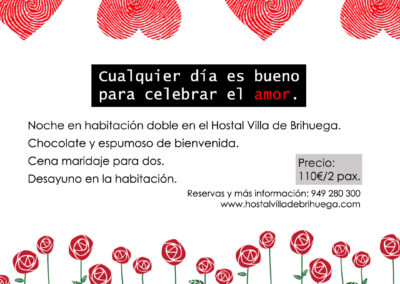 Te proponemos también un par de planes gastronómicos. Por un lado, nuestro menú de San Valentín para disfrutar en el Restaurante, con un precio de 19,50€ por comensal. Te recomendamos reservar mesa en el 949 280 300, ya que el aforo es limitado.